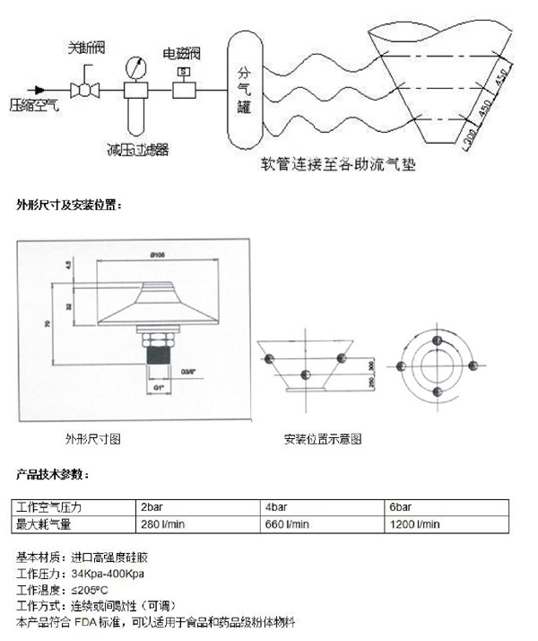 助流氣碟采用了耐磨的矽膠材料,在工作時可以同時產生吹氣、振動兩種動作,壓縮空氣沿筒倉壁向四周噴出,而且由於空氣壓力不斷變化,氣碟邊緣會產生高頻振動.這些都是有效促進料倉內粉體、顆粒物料向下流動。建議間歇性工作。注:工作溫度-30℃< 120℃